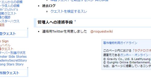 きのう、友達に教えてもらったのですが、 ROクエスト案内所管理人 (@roquestwiki) | Twitter ツイッターにこんなアカウントを見つけました。 クエスト案内所のTOPページの下の方に 控えめに書かれていました。 いつもお世話になってるクエスト案内所さん、頑…